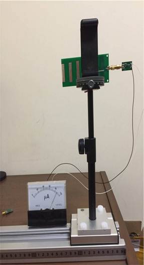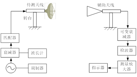天線的方向圖,測試系統(tǒng)框圖如下圖2所示。輔助天線作發(fā)射,由功率信號發(fā)生器激勵產(chǎn)生電磁波;被測天線作接收,被測天線置于可以水平旋轉(zhuǎn)的實驗支架上,接收到的高頻信號經(jīng)檢波后送給電流指示器顯示。