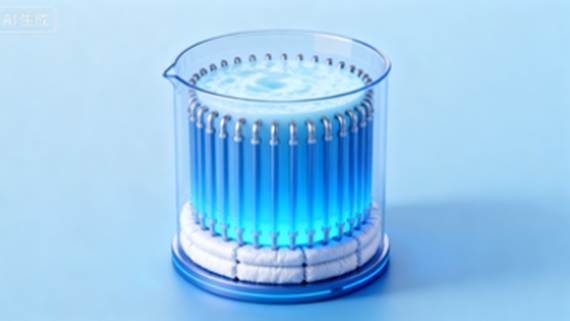 重點展示裝置結(jié)構(gòu)(含容器、石蠟、換熱管、保溫層)。風(fēng)格為簡約科技風(fēng),藍色調(diào)為主,突出熱量流動示意(紅色箭頭表吸熱,藍色箭頭表放熱)。