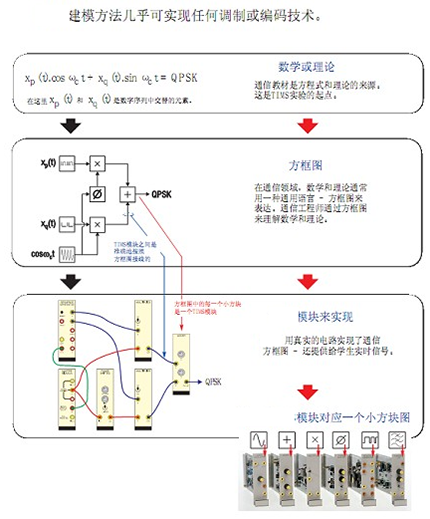 通信系統(tǒng)原理實(shí)驗(yàn)室主要設(shè)備采用設(shè)計(jì)型開(kāi)放式設(shè)計(jì)理念,跟以往驗(yàn)證型實(shí)驗(yàn)設(shè)備有本質(zhì)區(qū)別。整個(gè)系統(tǒng)采用基于方框圖的模塊化設(shè)計(jì),以數(shù)學(xué)函數(shù)方框圖形式來(lái)確定硬件基本模塊,靈活組合模塊以實(shí)現(xiàn)任何調(diào)制或編碼技術(shù)。