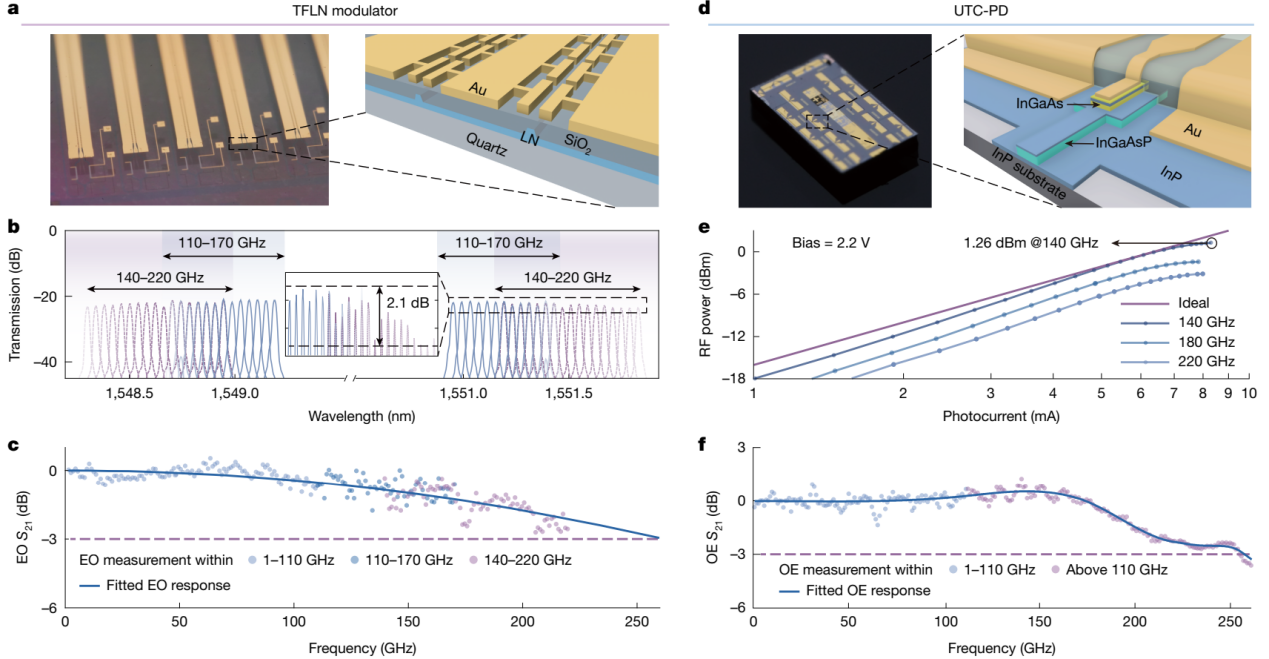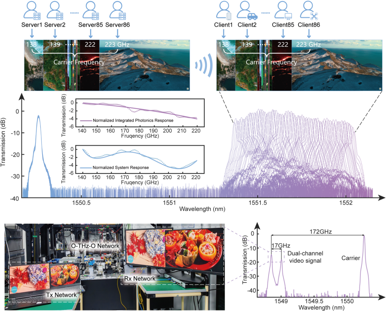 研究團隊采用集成光學方案,實現(xiàn)了250GHz以上超大帶寬的光電/電光轉(zhuǎn)換器件,薄膜鈮酸鋰調(diào)制器(TFLNMZM)和磷化銦探測器(InP UTC-PD)帶寬均創(chuàng)紀錄;谏鲜銎骷,研究團隊實現(xiàn)了光纖-無線一體化融合系統(tǒng)演示,光纖通信實現(xiàn)破紀錄的單通道256Gbaud(512Gbps)信號傳輸,太赫茲無線通信實現(xiàn)破紀錄的單通道400Gbps信號傳輸,并完成了86路8K高清實時視頻的無線傳輸演示。這一里程碑式的突破有望重塑電信通訊系統(tǒng)架構(gòu),為未來全光互聯(lián)的愿景奠定研究基礎,推動我國在該領(lǐng)域?qū)崿F(xiàn)跨越式發(fā)展。