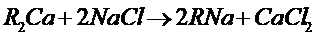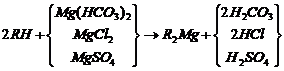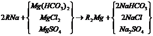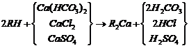 當含有鈣鹽及鎂鹽的水通過裝有陽離子交換樹脂的交換器時,水中的Ca2+及Mg2+便與樹脂中的可交換離子(Na+或H+)交換,使水中Ca2+、 Mg2+含量降低或基本上全部去除,這個過程叫做水的軟化。樹脂失效后要進行再生,即把樹脂上吸附的鈣、鎂離子置換出來,代之以新的可交換離子。鈉離子交換用食鹽(NaCl)再生、氫離子交換用鹽酸(HCl)或硫酸(H2SO4)再生;痉磻饺缦。