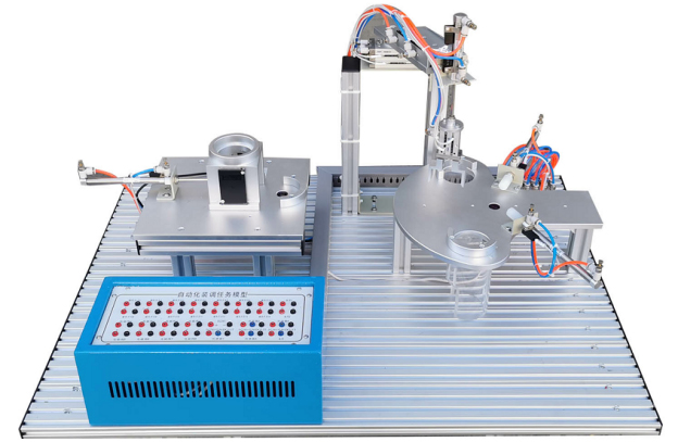 該任務(wù)由氣動機(jī)械手、分揀機(jī)構(gòu)、上料機(jī)構(gòu)、安裝網(wǎng)孔板、電氣接口板、電磁閥組等組成,安裝網(wǎng)孔板由有1.2mm優(yōu)質(zhì)不銹鋼鋼板加工制作,機(jī)構(gòu)件由鋁材機(jī)加氧化而成,機(jī)構(gòu)全部為散件提供,按教學(xué)要求由學(xué)員自己動手組裝、接線并通過接口板與外部連接調(diào)試。