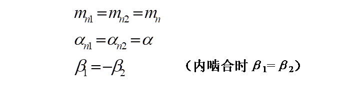 一對外嚙合斜齒圓柱齒輪的正確嚙合條件是:齒輪副的法面模數(shù)和法面壓力角分別相等,而且螺旋角大小相等,旋向相反,即