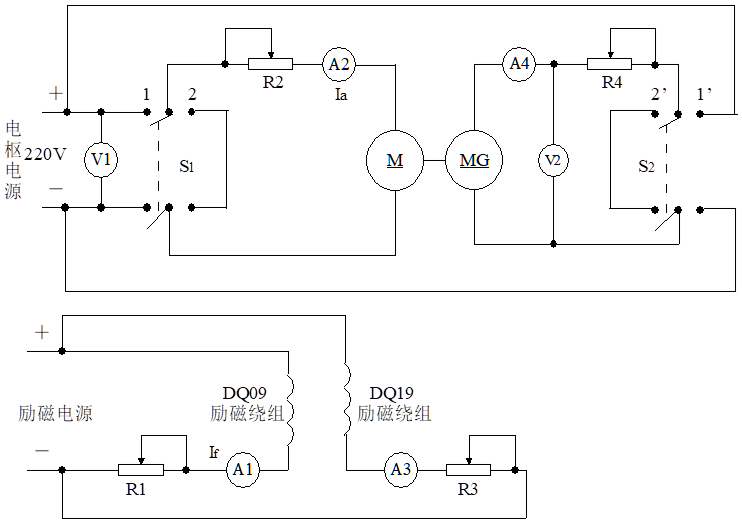 按圖4-1接線,圖中M用編號(hào)為DQ09的直流并(他)勵(lì)電動(dòng)機(jī)(接成他勵(lì)方式),MG用編號(hào)為DQ19的校正直流測(cè)功機(jī),直流電壓表V1、V2的量程為300V,直流電流表A1、A3的量程為200mA,A2、A4的量程為5A。R1、R2、R3、及R4依不同的實(shí)訓(xùn)而選不同的阻值。
