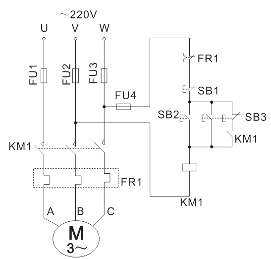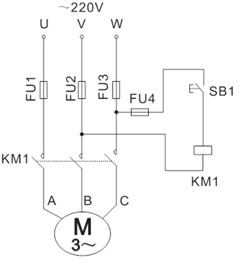 按圖5-6接線。圖中SB1、KM1、FU1、FU2、FU3、FU4為掛件GDQ39-1上的器件,電機(jī)選用DQ10(△/220V)。接線時(shí),先接主電路,它是從220V三相交流電源的輸出端U、V、W開始,經(jīng)熔斷器FU1、FU2、FU3、接觸器KM1主觸點(diǎn)到電動(dòng)機(jī)M的三個(gè)線端A、B、C的電路,用導(dǎo)線按順序串聯(lián)起來,有三路。主電路經(jīng)檢查無誤后,再接控制線路,從熔斷器FU4插孔W開始,經(jīng)按鈕SB1常開、接觸器KM1線圈到插孔V。線路接好經(jīng)指導(dǎo)老師檢查無誤后,按下面步驟進(jìn)行實(shí)訓(xùn):