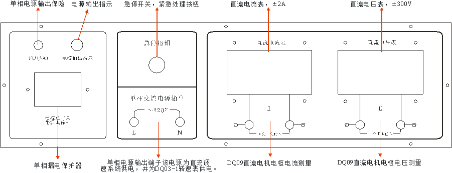 圖1-1 鋁質(zhì)面板各部分說(shuō)明示意圖2.小容量晶閘管直流調(diào)速系統(tǒng)面板