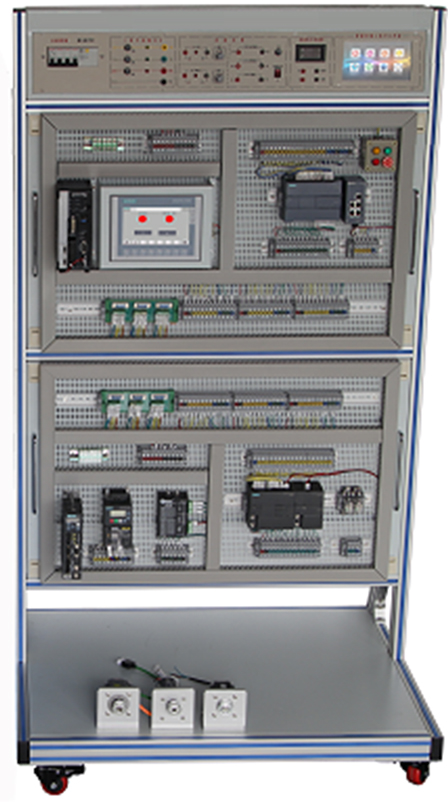 采用立式網(wǎng)孔板結構,由工業(yè)鋁型材搭建而成,上方為電源控制模塊,下方為網(wǎng)孔式安裝板。底部設有帶剎車萬向輪,方便移動布局。臺架尺寸約為1000×800×1800mm。 頂端電源模塊,提供實訓所需的三相交流380V、單相220V電源接口,具有啟動、停止、急停系統(tǒng),設有漏電保護、電源指示、過流保護等功能。設有DC24V控制電源,配有控制開關及輸出接口,帶短路保護功能。 |