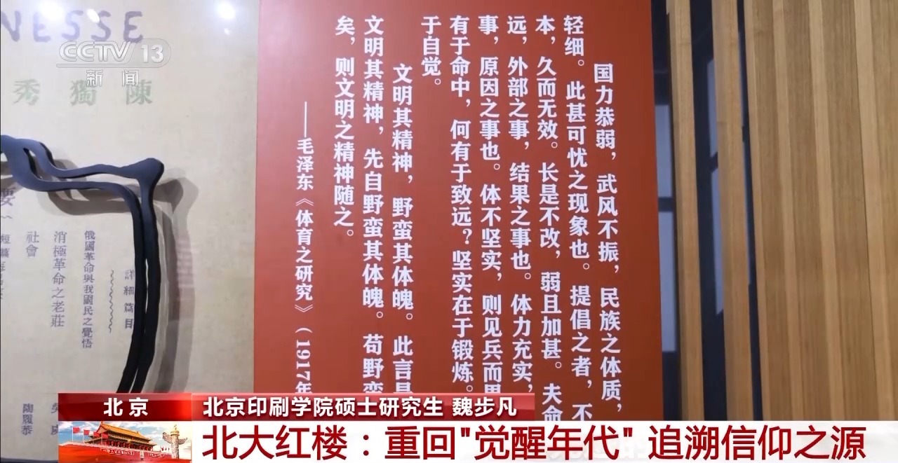 北京印刷學(xué)院碩士研究生 魏步凡:我印象比較深刻的,當(dāng)時發(fā)表在《新青年》上一篇毛澤東的文章就是《體育之研究》。當(dāng)時是陳獨秀提出了對新青年的6大標(biāo)準(zhǔn),青年時期毛澤東就覺得還應(yīng)該加入一個體育,所以發(fā)表文章說國風(fēng)羸弱,不能只在精神上進(jìn)行豐富,體魄也要進(jìn)一步加強。我覺得當(dāng)時是一個非常先進(jìn)的思想。