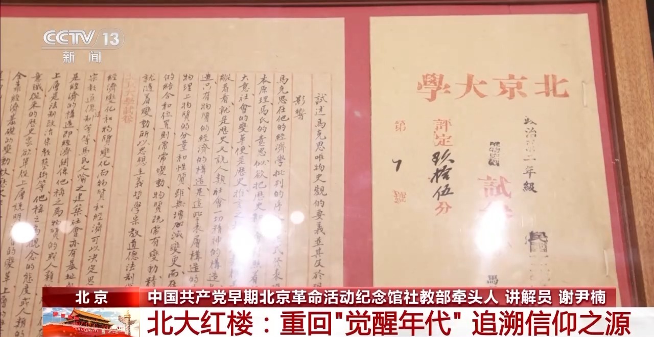 中國共產(chǎn)黨早期北京革命活動紀(jì)念館社教部牽頭人 講解員 謝尹楠:這個是100多年前學(xué)生的試卷,當(dāng)時李大釗批閱北大哲學(xué)系學(xué)生唯物史觀的試卷,他也是中國最早將馬克思主義引進(jìn)中國高校課堂、引進(jìn)試卷的人,在封面上可以看到學(xué)生們都得到了不錯的成績。