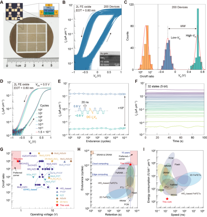 該類器件是目前已知工作電壓最小、能耗最低且耐久性最優(yōu)的鐵電晶體管,標志著二維鐵電器件性能達到了新的高度。此項成果構(gòu)建了全球首個晶圓級二維鐵電材料體系,突破了后摩爾時代非馮·諾依曼架構(gòu)芯片在新材料合成與異質(zhì)集成方面的關(guān)鍵技術(shù)瓶頸。