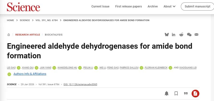 生物催化技術(shù)的演進,正迎來歷史性轉(zhuǎn)折。北京大學化學與分子工程學院雷曉光團隊在Science上發(fā)表一篇研究長文,文章標題為“Engineered aldehyde dehydrogenases for amide bond formation”。他們發(fā)明了一種全新方式,通過重寫酶的源代碼,提出并驗證了一種前所未有的生物催化策略,徹底顛覆了制造藥物關(guān)鍵部件“酰胺鍵”的方法。