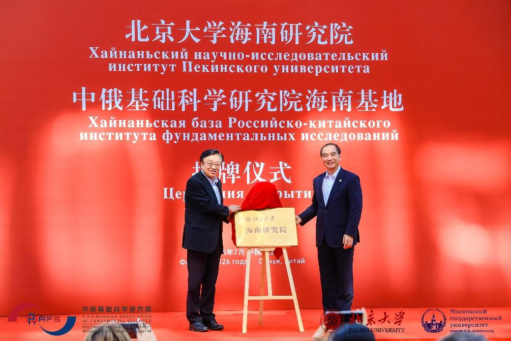 馮飛、龔旗煌共同為北京大學(xué)海南研究院揭牌,王祺揚(yáng)、樸世龍共同為中俄基礎(chǔ)科學(xué)研究院海南基地揭牌。